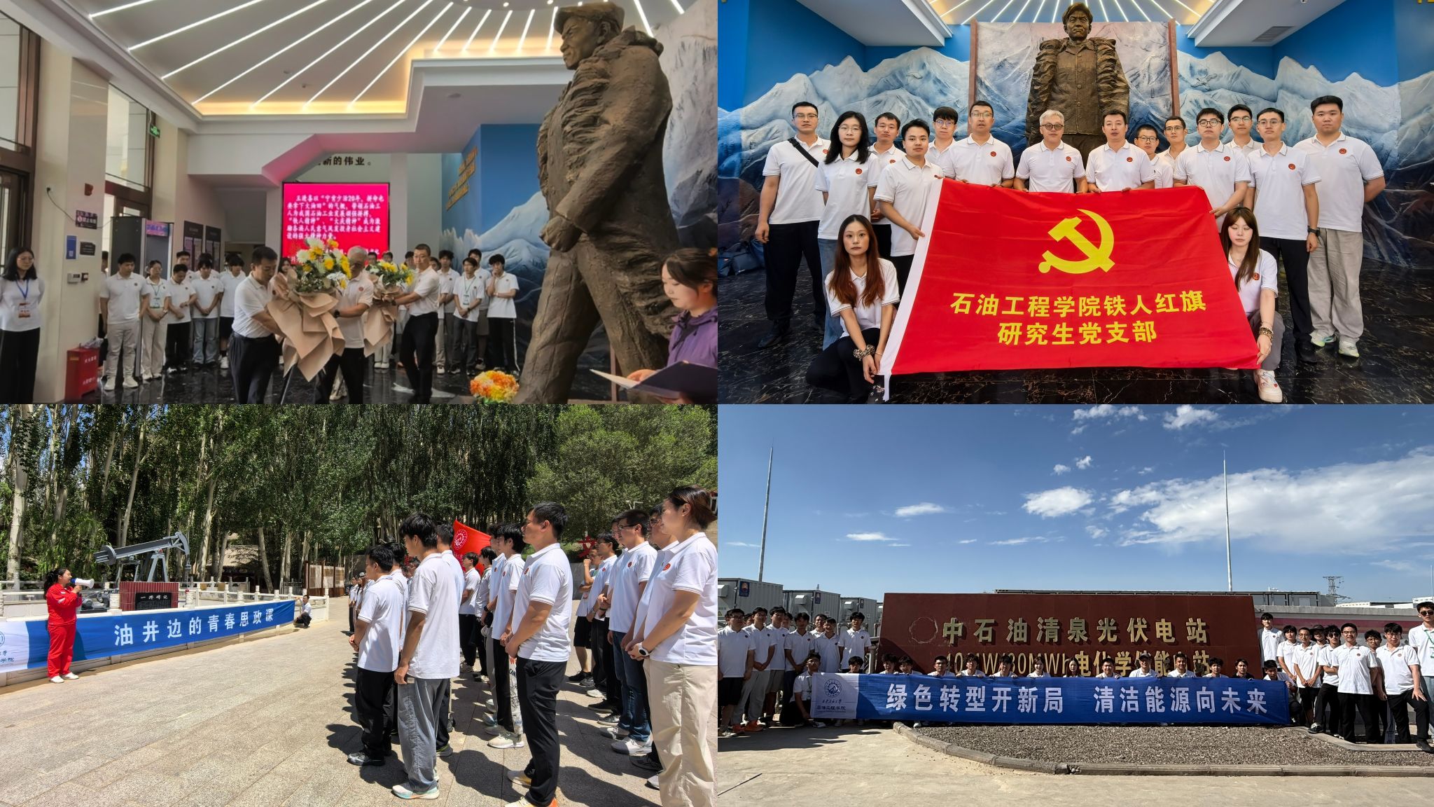 7月16日上午,研学团从酒泉出发前往玉门老油区,首先参观了铁人纪念馆,在铁人王进喜雕像前,学员们整齐列队,面对党旗庄严宣誓。并向铁人雕像敬献花篮,表达崇高敬意。随后,研学团深入地下70米参观了宏伟的693人防工程,并在玉门老城区的油城公园瞻仰了新中国西北石油工业奠基人、西北石油工业学校创建者之一的孙健初纪念碑和铁人王进喜铜像。