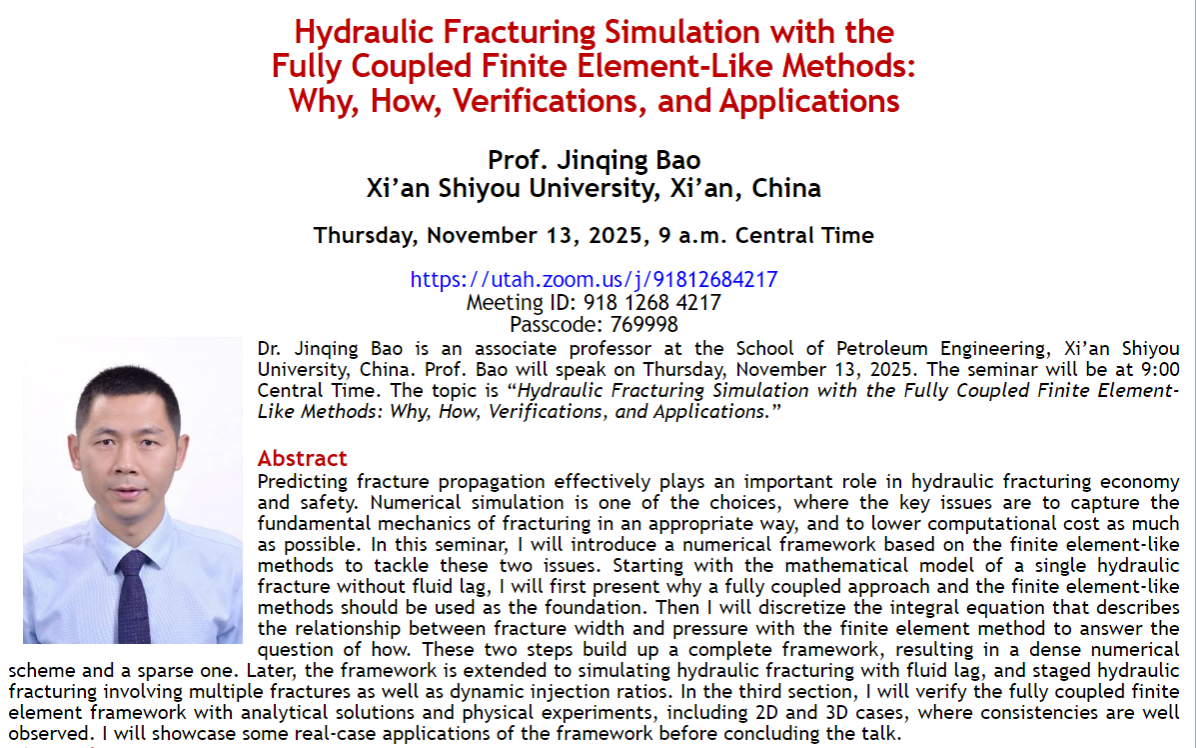 1113日,我院包劲青教授应美国岩石力学学会(American Rock Mechanics Association, ARMA)水力压裂分会的邀请,作在线国际学术报告。包劲青教授的报告题目为Hydraulic Fracturing Simulation with the Finite Element-Like Methods: Why, How, Verifications, and Applications