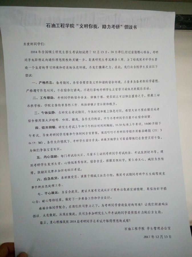 本次倡议书从严格作息、工作帮助、午休安静、错开用餐、内心鼓励、应急处突、平心致远等七个方面向全院学生发出倡议,呼吁全体同学从我做起,共同为参加研究生入学考试的同学提供强有力的后方支持。