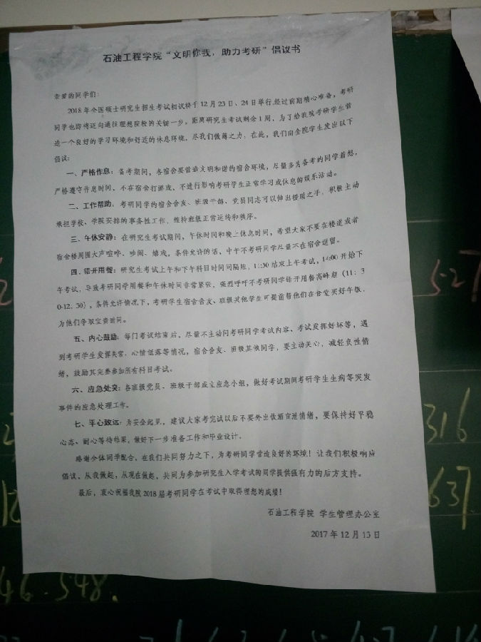 为了给我院考研学生营造一个良好的学习环境和舒适的休息环境,便于他们顺利进行最后冲刺和完成为期两天的考试。12月13日,在学院领导的帮扶和引导下,1024社区 2014级团总支在毕业班学生所住12和14号宿舍楼公告栏上张贴了主题为“文明你我,助力考研”倡议书。