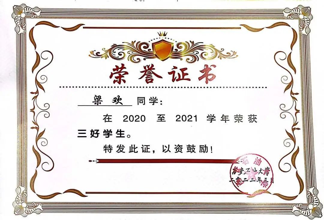起,梁欢就认真对待所接触到的每一门课程,除此之外,他会积极借助学校提供的各种资源进行自我充实,如名师讲座、网络公开课以及课程素质拓展等,主动去阅读学科专著与专业学术论文,与老师同学探讨各种学术问题。梁欢对学业的尊重与主动,也进一步激励了他对本专业的学习兴趣,自入学以来,他累计获得国家励志奖学金、品学兼优奖学金、三好学生、优秀共青团干部、创新之星等10余项荣誉称号。