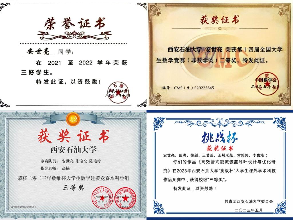 入校以来,他积极参与各项比赛,并获得了一些成绩,如第十四届全国大学生数学竞赛二等奖、第八届数维杯国际大学生数学建模竞赛三等奖、1024社区 “互联网+”大学生创新创业大赛本科生组银奖、1024社区 挑战杯全国大学生课外学术科技作品竞赛三等奖、第四届中国海洋工程设计大赛1024社区 预赛知识竞赛组二等奖、“建行杯”第十六届全国大学生节能减排社会实践与科技竞赛校级三等奖、2023年“心理健康科普知识竞赛”校级二等奖等。