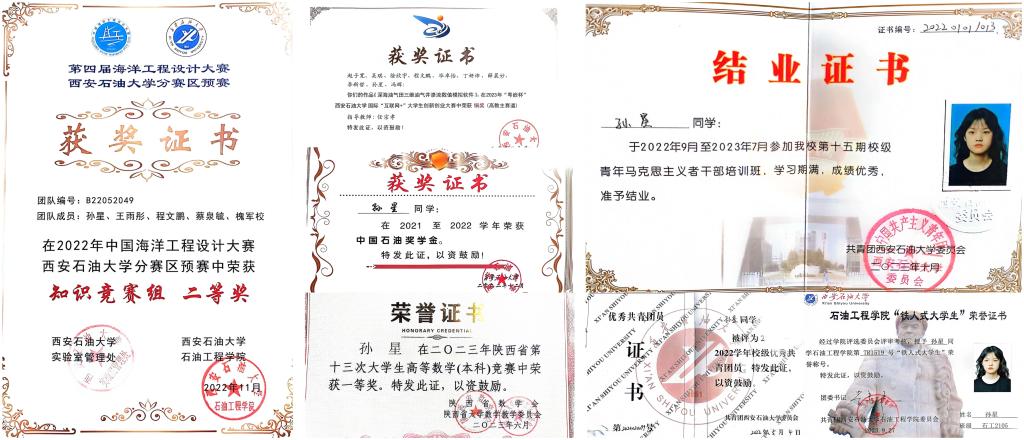 大学三年综合专业第一,绩点达到4.18,一次性通过英语四六级考试,获得中石油奖学金、连云港徐圩新区菁英人才二等奖学金。在学业上,她本着“书山有路勤为径,学海无涯苦作舟”的精神,脚踏实地、努力拼搏、不断进取。同时,她课程学习之余注重专业知识实践运用,积极参加各项竞赛,并荣获陕西省第十三次高等数学竞赛一等奖、“互联网+”大学生创新创业大赛中荣校赛铜奖等。
