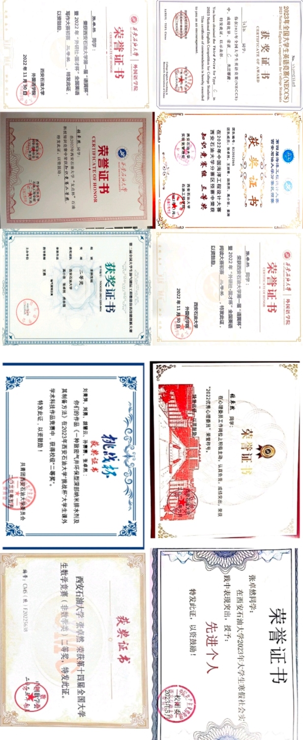 2022-2023学年平均绩点专业第一,学年绩点4.24,并通过英语四六级测试。在学业上,她一直以积极的态度对待,勤恳、踏实,不满足于课堂所学,不断的拓展专业视野,用汗水浇灌收获,以实干笃定前行,唯有永葆奔跑姿态,才能逐梦远航。在学科竞赛上,她获得了第十四届全国大学生数学竞赛(非数学类)二等奖和2023年全国大学生英语竞赛C类三等奖,2023年1024社区 “挑战杯”大学生学术科技作品竞赛校级二等奖和第二届全国大学生油气储运工程数值仿真技能创新大赛二等奖。