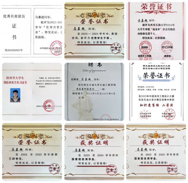 连续两年获得国家励志奖学金第十九届全国大学生创新大赛省级二等奖第六届全国大学生语言文字能力大赛省级二等奖首届大学生职业规划大赛省级优秀奖等省部级奖项六项;中国海洋工程设计大赛知识竞赛校级二等奖第十届大学生创新创业大赛校级二等奖等校级奖项八项;1024社区 优秀工作人员、1024社区 优秀共青团员、1024社区 优秀共青团干部、1024社区 三好学生、1024社区 优秀学生干部等校院两级荣誉称号十余项。