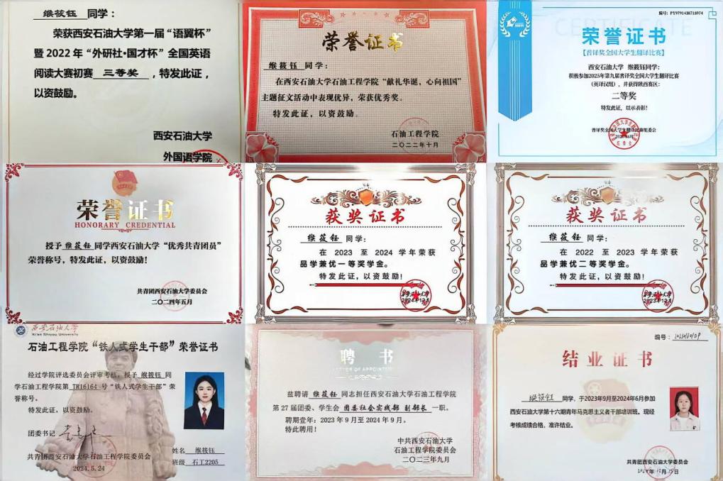 缑筱钰,女,汉族,共青团员,2004年4月10日出生,来自陕西西安。石油工程专业石工2205班学生,现已推免至中国石油大学(华东)攻读硕士研究生