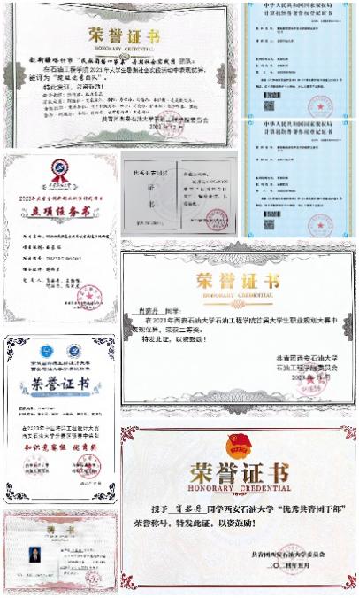 学习之余,她积极参加科研竞赛,不断提升自己的学术研究能力和创新精神。获得第十八届iCAN大学生创新创业大赛中获西北赛区三等奖、中国石油工程设计大赛中获钻井工程设计省级优秀奖、中国国际大学生创新大赛陕西省铜奖等奖项。