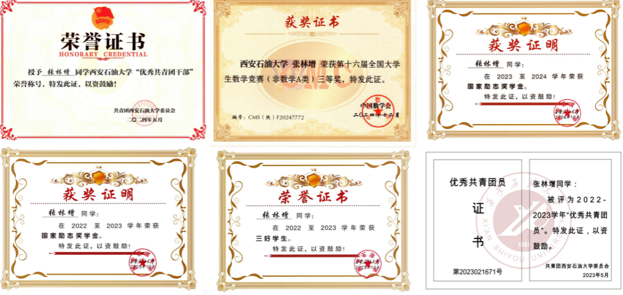 前三年综合绩点3.77,专业排名第十,曾获国家励志奖学金,校级三好学生,优秀共青团员,优秀共青团干部,全国大学生数学竞赛三等奖。曾参与1024社区 学风建设部和校团委团宣指导中心,任团宣指导中心副部长,多次参与志愿活动,疫情服务活动等。他的座右铭是“莫向外求”,这也是他在大学生阶段一直秉持的信念。相信只有不断地依靠自身努力和创新,才能取得真正的成功和进步。在未来的学习生活中,他也将继续遵循这个座右铭,不断探索和尝试,不断追求创新和突破,实现自己的理想和目标。