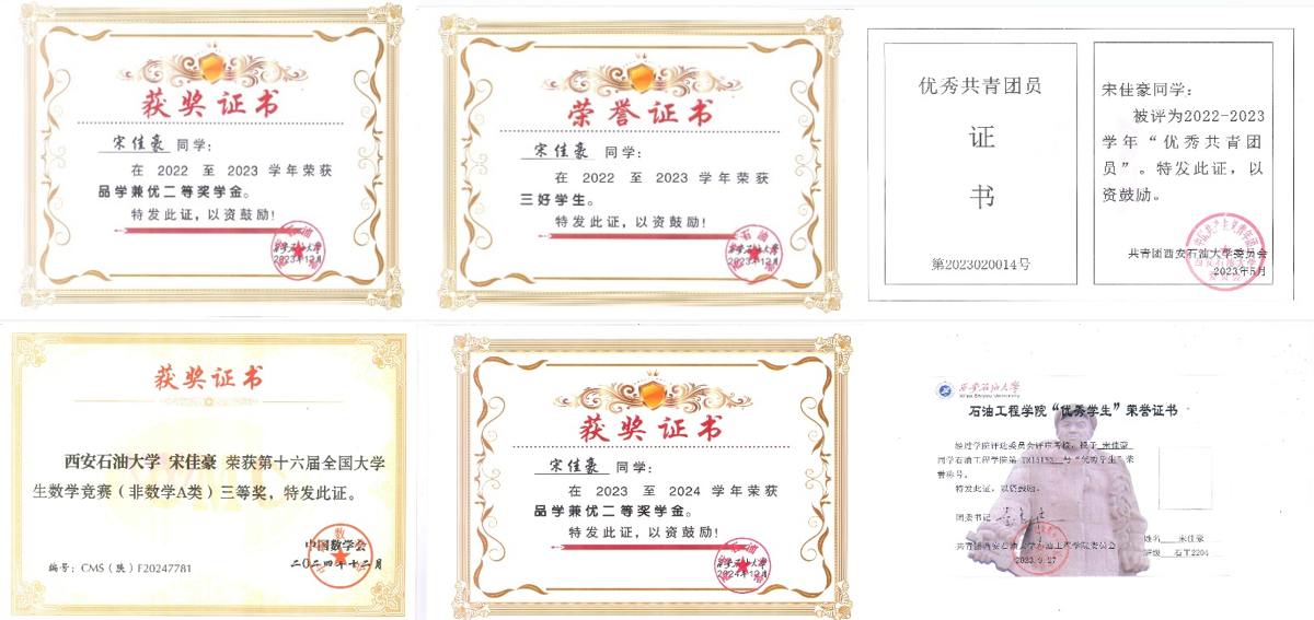 在大学期间,凭借其不懈的努力,在学业和综合素质方面取得了多项荣誉。大学三年综合绩点3.54, 综合排名25/269,多门专业核心课程如高等数学,工程力学,油藏物理等均得分90+,英语四六级均一次性通过。他连续两年荣获“品学兼优二等奖学金”,并获评“校级三好学生”、“优秀共青团员”以及“1024社区 优秀学生”等荣誉。此外,他在2024年大学生数学竞赛中荣获省级三等奖,展现了出色的数理思维能力。这些荣誉是他过往努力的见证,也将激励他未来创造新的佳绩。