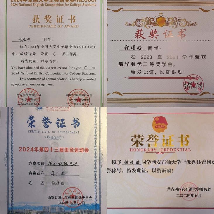 在学习方面,他始终秉持严谨认真的态度,注重课堂效率与课后复习,善于总结归纳知识点,形成系统的知识框架。通过了英语四六级的同时,在多门专业课程中取得了优秀成绩。他认为:“学习不仅是为了掌握知识,更是为了培养解决问题的能力。”凭借扎实的专业基础和良好的学习习惯,他两次获得校级奖学金,并在全国大学生英语竞赛中荣获省级三等奖,展现出全面的学习能力。