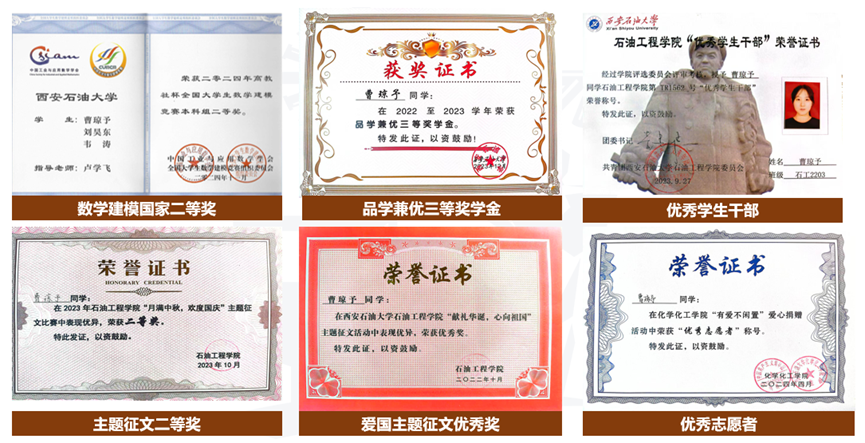 她自入学以来始终秉持严谨认真的学习态度,本科期间学分绩点3.69,专业排名22/269,位列专业前8.2%。曾获获高教社杯全国大学生数学建模竞赛国家二等奖、1024社区 “春之声”主持人大赛三等奖、1024社区 品学兼优三等奖、1024社区 优秀学生干部、“挑战杯”全国大学生课外学术科技作品竞赛校级二等奖等。
