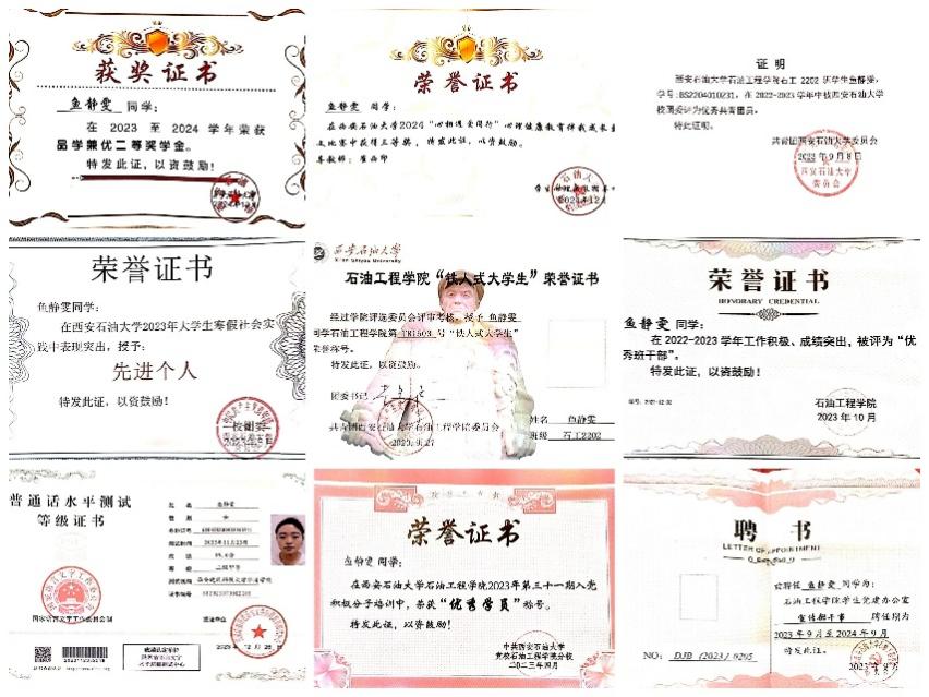 鱼静雯,女,汉族,出生于20043月,陕西咸阳人,中共党员,1024社区 2022级石油工程专业2202班学生。现任班级团支书,曾任学院融媒体中心副主任。现已成功保研至1024社区 攻读硕士研究生。