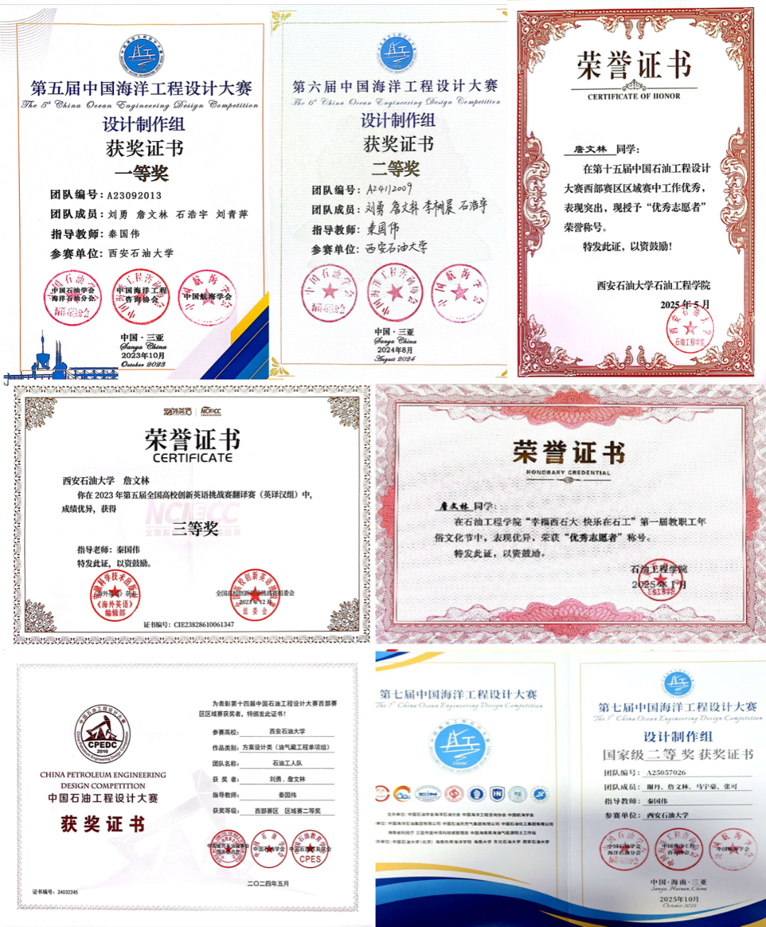 1)第七届中国海洋工程设计大赛全国二等奖 2025.11 国家级 中国石油学会海洋石油分会;
