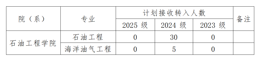 石油工程专业拟接收2024级转专业学生人数限30人,海洋油气工程专业拟接收2024级转专业学生人数限5人。